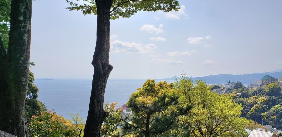 熱海駅からバスで数分、バス停から長い階段を登ったところにあります。